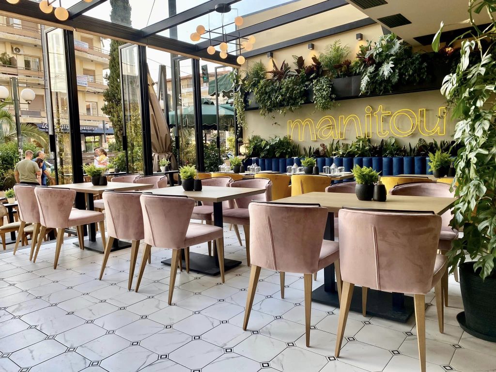 MANITOU All day bar & resto. My interior furniture and lighting design στην Νέα Φιλαδέλφεια, Αθήνα. Φλοράλ αισθητική σε χρώματα, υφάσματα και ταπετσαρίες. Ένας all day χώρος με πολλά φυτά και comfort κουζίνα. Η γυάλινη πέργκολα, όπως και η κυλινδρική σκάλα από μεταλλικούς σωλήνες και μασίφ ξύλο δρυς, είναι σχεδιασμένη για το πρότζεκτ αυτό αποκλειστικά.